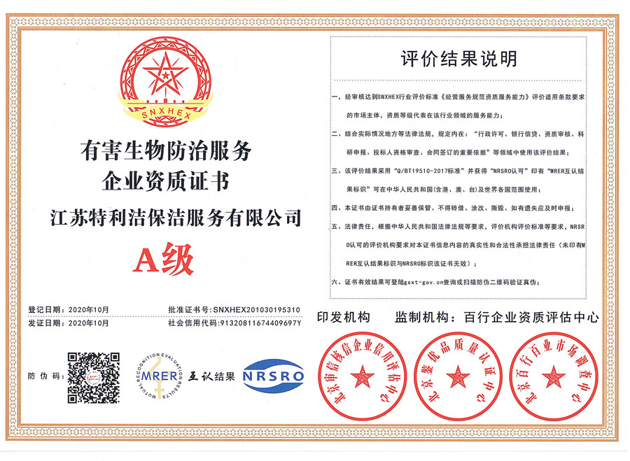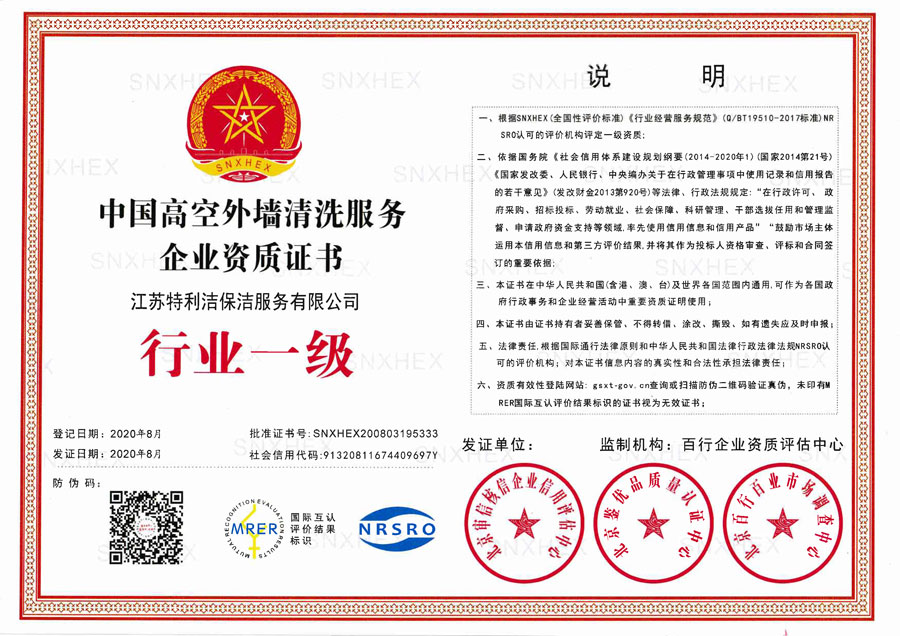 江蘇特利潔保潔服務有限公司(前稱為淮安市特利潔保潔服務有限公司),成立于2003年,于2018年經工商變更登記為“江蘇特利潔保潔服務有限公司”,是經工商部門登記注冊的合法企業。公司員工經系統培訓后上崗,本公司全部采用特利潔專業清洗設備、藥劑,并秉承了特利潔先進的管理模式,具備了專業的清洗技術、服務和網絡優勢以及一批訓練有素的專業清潔隊伍及管理人員,致力于推動淮安清洗行業朝著規范化、專業化、標準化方向發展。公司成立至今,經過我們全體員工的不懈努力,以及本著“誠信、專業、周到”的服務使得接受過我們服務的每一位客戶均能成為我們的長期合作對象。公司也從起初十幾名員工的小公司逐漸發展壯大,現已初具規模,并在保潔行業當中占據一定份額。現與恒大集團等世界500強企業建立戰略合作。2018年10月公司取得三A信用評級、三A重合同守信用單位...